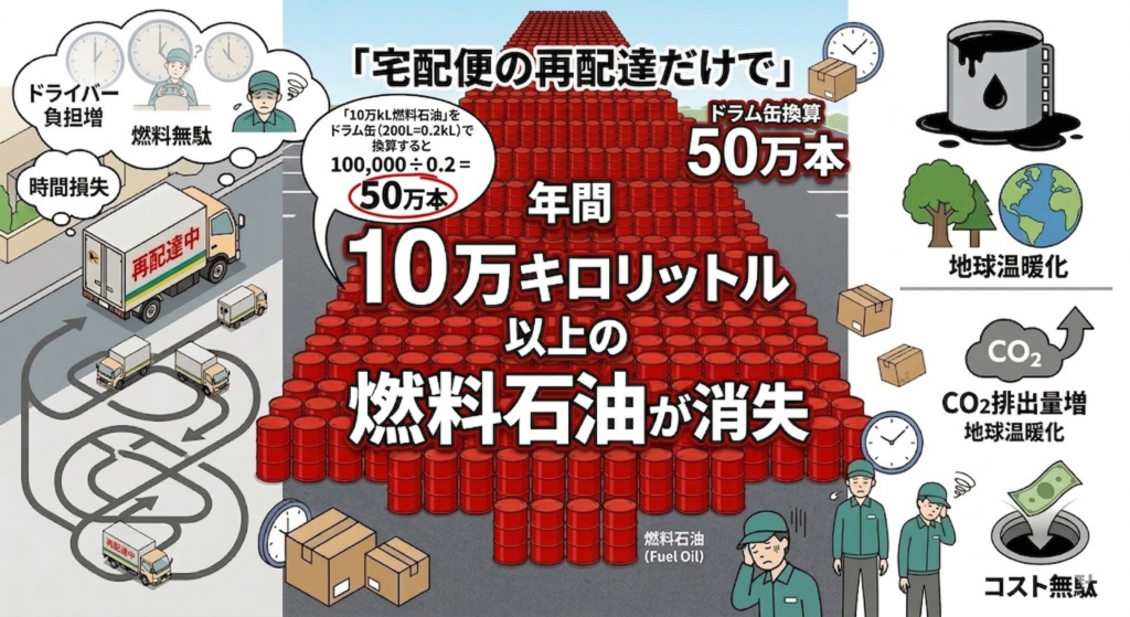 なんと年間10万kLを越える燃料が、再配達で消失しているんですね!